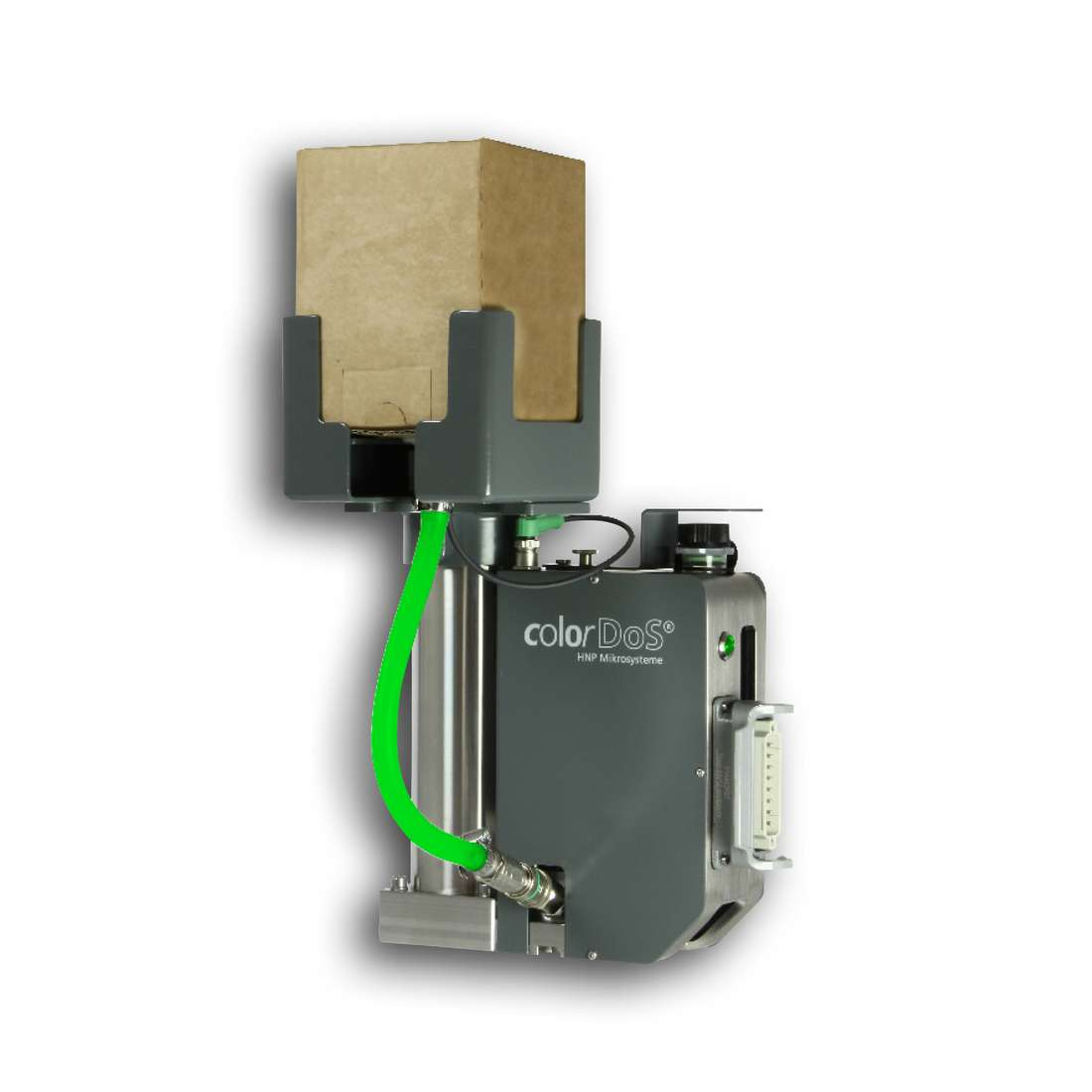 The compact dosing system colorDoS was specially developed by HNP Mikrosysteme for this task. The system is installed on the injection molding machine (SGM) above the screw conveyor and doses the liquid color directly into the flow of granules. colorDoS contains, among other things, a micro annular gear pump, a dosing nozzle, and intuitive display control. The integrated pump ensures exact dosing and high color fidelity with minimal color addition. A modular micro annular gear pump mzr-7245 is used. Depending on the dosing time and the viscosity of the paint, the pump achieves a dosing volume of 0.02 to 100 g of paint per shot.