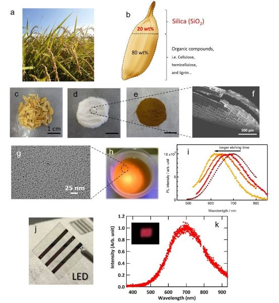 The team used a combination of milling, heat treatments, and chemical etching to process the rice husk silica: First, they milled rice husks and extracted silica (SiO2) powders by burning off organic compounds of milled rice husks. Second, they heated the resulting silica powder in an electric furnace to obtain Si powders via a reduction reaction. Third, the product was a purified Si powder that was further reduced to 3 nanometer in size by chemical etching. Finally, its surface was chemically functionalized for high chemical stability and high dispersivity in solvent, with 3 nm crystalline particles to produce the SiQDs that luminesce in the orange-red range with high luminescence efficiency of over 20%.